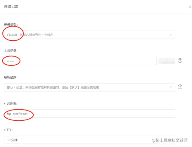 二、将需要使用的域名在域名解析服务商控制台设置CNAME指向 frp 服务器地址,具体参见www.ioiox.com/archives/26…