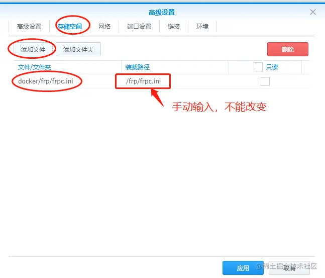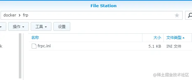 在群晖NAS任意位置新建或者上传frpc.ini文件,建议使用群晖的文本编辑套件来创建和编辑.ini文件,避免Windows下的后缀问题导致容器错误。本文以/Docker/frp/frpc.ini为例。