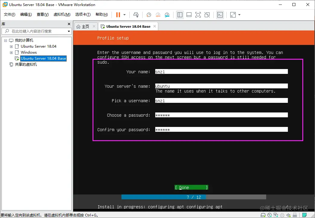名字、密码等数据,然后继续。虚拟机的密码一般用123456即可 -