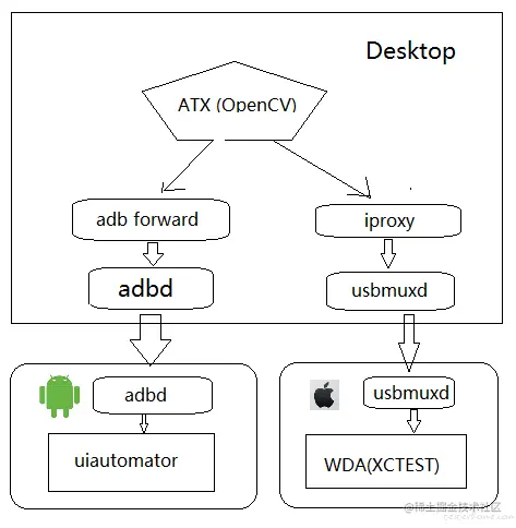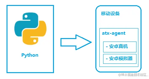 如图所示,python-uiautomator2主要分为两个部分,python客户端,移动设备