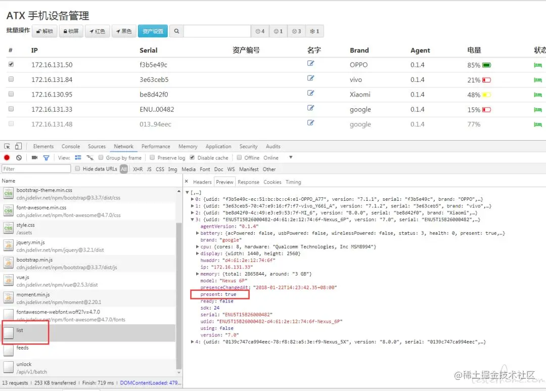 1.在 ATX server自带的设备管理页面中,列出了当前可用的设备列表。于是尝试从这个页面的网络请求中获取设备列表,果然有收获: