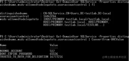我们感兴趣的字段是 msds-allowedtodelegateto,但是也对帐户的 userAccountControl 属性进行了修改。 实际上,如果计算机或用户对象的 userAccountControl 值包含 TRUSTED_TO_AUTH_FOR_DELEGATION ,那么任何拿到该帐户权限的用户都可以模拟 msds-allowedtodelegateto中设置的 SPN。 Ben 提到要修改这些参数 SeEnableDelegationPrivilege 是必需的,后续我将更深入地讨论这个问题。