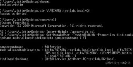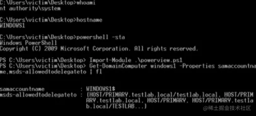 指定的"服务"是允许帐户在假冒其他用户时访问的服务主体名称。 在上面的例子中是 HOST/PRIMARY.testlab.local。 在我们详细讨论它是如何工作的之前,下面是目标对象在 PowerView 中的样子: