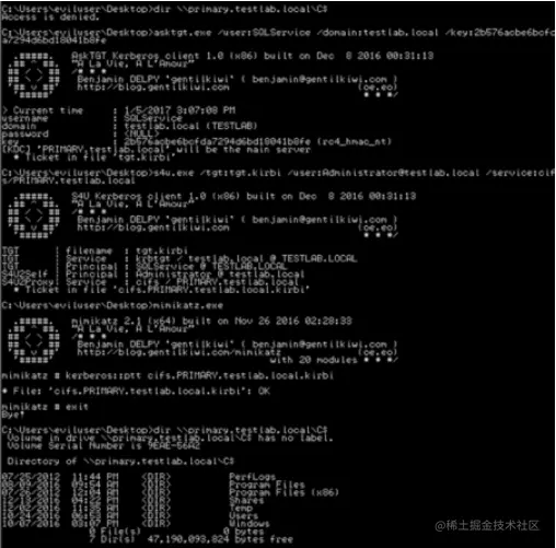 你可以使用 asktgt.exe /s4u.exe 执行此方案,其执行方式几乎与场景1完全相同。 只需将 / assword:PLAINTEXT 替换为 /key: NTLM,如下图所示: