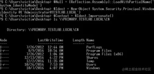 正如微软官方所详细说明的,在使用 WindowsIdentity 时,在大多数情况中,默认情况下返回的是"标识级"的标记。 这允许你查看哪些组与用户标记是相关联的,但不允许重用访问。 为了假冒上下文以访问其他网络资源,需要一个模拟级别的令牌,只有在请求帐户拥有"Act as part of the operating system"用户权限(SeTcbPrivilege)时才返回该令牌。 这种权限只在默认情况下授予 SYSTEM 账户,但是因为我们已经在网络上使用计算机帐户的权限拿到了 SYSTEM 权限,所以我们不需要担心这一点。