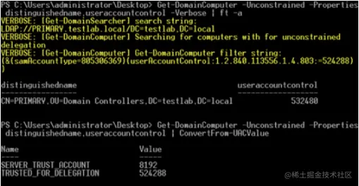 如何判断哪些机器具有无约束委派设置? 这实际上非常简单: 搜索任何具有 userAccountControl 属性的机器,该属性包含 ADS_UF_TRUSTED_FOR_DELEGATION。 你可以使用 LDAP 过滤器‘(userAccountControl:1.2.840.113556.1.4.803:=524288)’,这是 PowerView 的 Get-DomainComputer 函数在传递 -Unconstrained 标志时所做的: