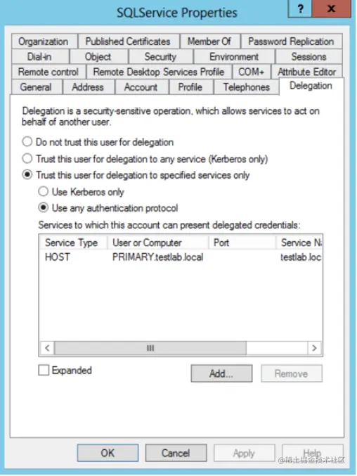 从本质上讲,约束委派是一种可以在假冒其他用户时准确地限制特定机器或帐户可以访问到某些服务的方法。 以下是配置了约束委派的服务帐户在活动目录 GUI 中的样子: