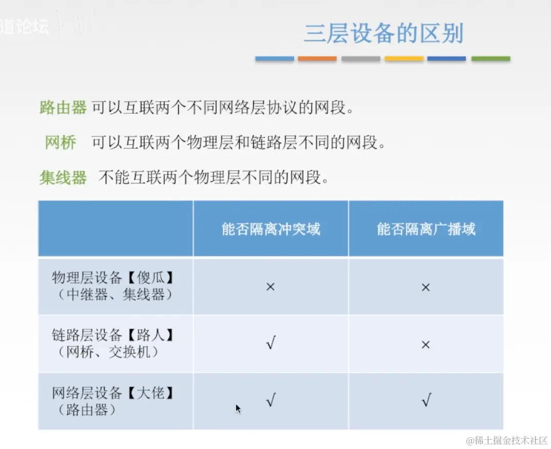 - 路由器:网络层,可以互联不同网络层协议的网段