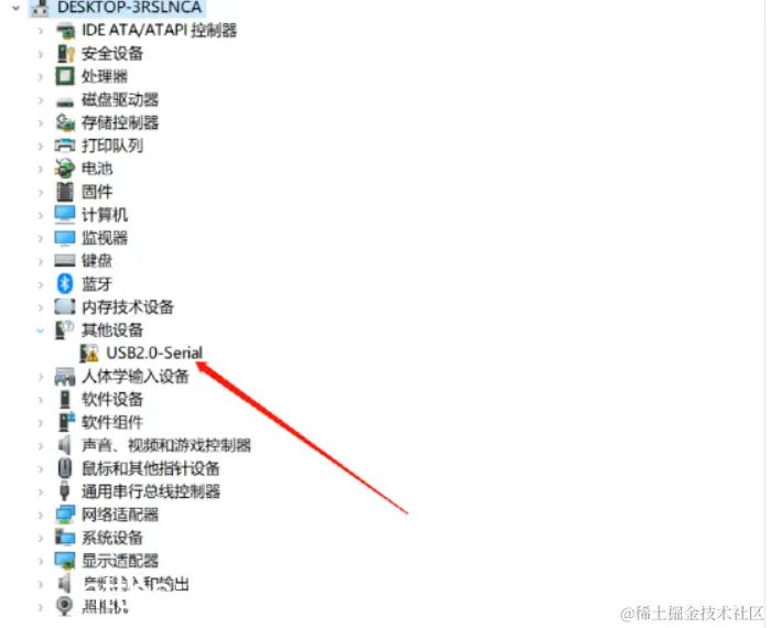 如果没有安装该驱动,当开发板插上电脑的USB时,电脑的设备管理器是无法查看到COM口的,如下图: