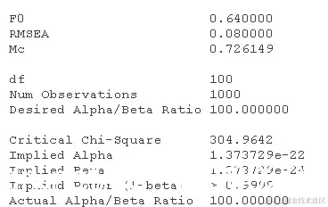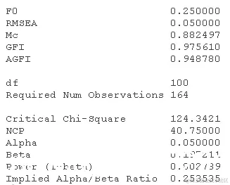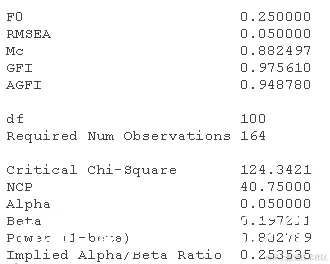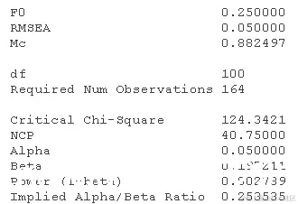 现在我们也得到了RMSEA=0.05的GFI和AGFI等效值,假设df=100,p=20。当然也可以不指定所需的效能,而是指定可接受的β误差。例如,调用