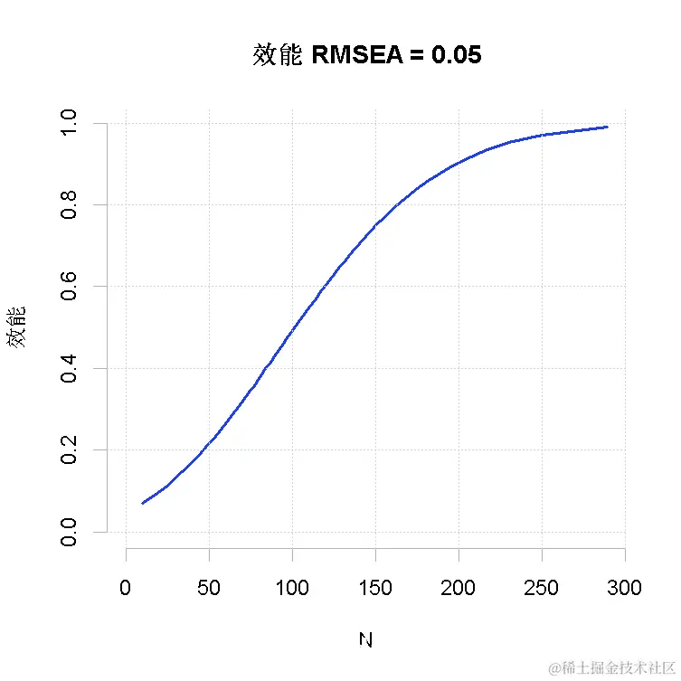 这表明,当N>250时,一个相关的RMSEA=0.05的模型被拒绝的效能非常大,而当N<100时,效能就很小。