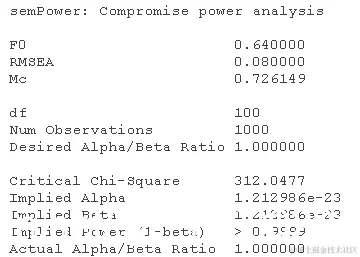 事后效能分析的目的是确定在给定的样本量下,在一定的α误差下检测特定效应的实际达到的效能。用结构方程模型的语言来说,事后效能分析问的是:"在我手头的样本中,有多大?在我手头的样本中,如果我的模型确实是错误的(至少在所选效应定义的范围内),那么伪造我的模型的概率(力量)有多大?进行事后效能分析需要明确阿尔法误差、样本量、效应的类型和大小以及模型df。同样,根据所选择的效应大小指标,可能还需要定义观察变量的数量。假设,我们希望在样本量为N=1000的情况下达到的效能能够检测到模型(涉及df=100自由度)的错误,α误差为0.05,其中错误拟合量对应于RMSEA=0.05。我们将结果存储在一个名为ph1的列表中。