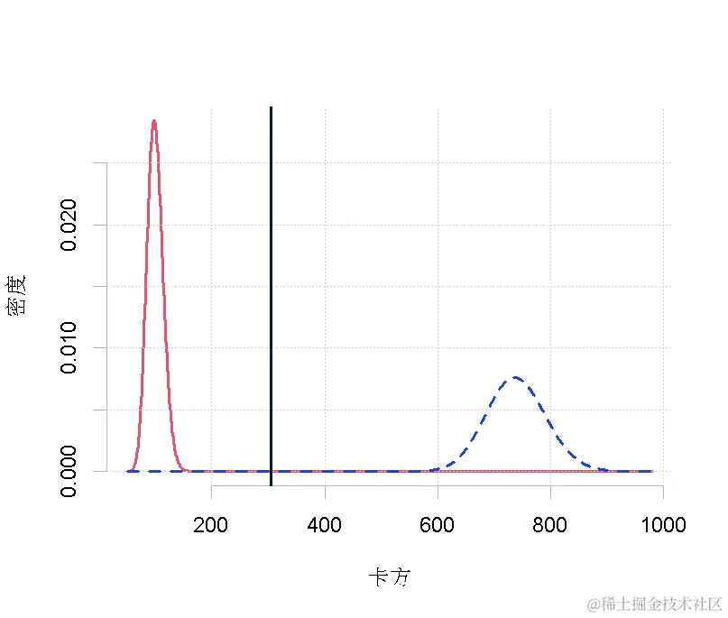结果显示,选择临界Chi-Square=312与平衡错误概率有关,α=1.2e-23和β=1.2e-23。按照要求,这两个错误概率都一样大。如果出于某种原因,你希望错误概率不同(例如,因为你认为错误地接受一个不正确的模型比错误地拒绝一个正确的模型要差100倍),你可以改变abratio参数。例如,要求α误差是β误差的100倍,可以通过设置 abratio = 100 来实现。