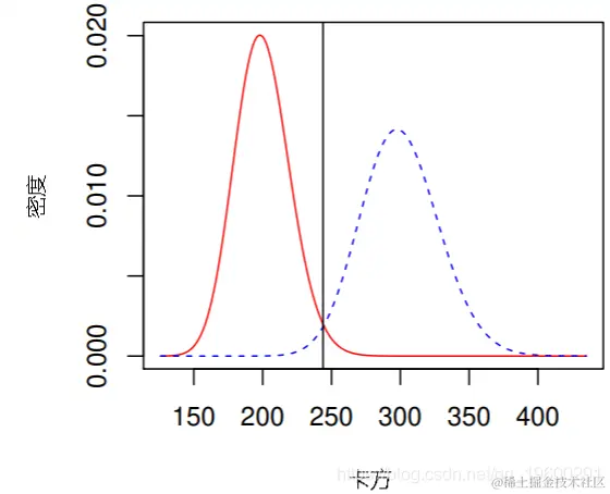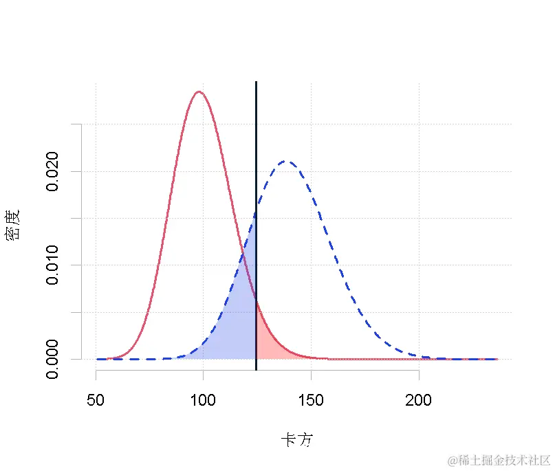 图1描述了中心(实线)χ 2(df)和非中心(虚线)χ 2(df,λ)分布,df=200,λ=100。中心分布χ 2(df)在临界值右侧的面积反映了α误差。实线表示临界值为234,对应于α=0.05。虚线表示从折衷效能分析中得到的临界值为244,与α=0.018有关。临界值左边的χ 2(df,λ)分布区域是β-错误概率(临界值234和244的β=0.006和β=0.018)。统计效能定义为1-β,即临界值右边的非中心χ 2(df,λ)分布下的面积。