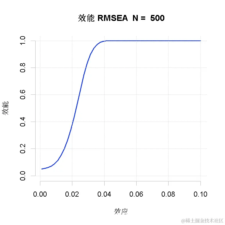 这表明,在N=500的情况下,一个相关的RMSEA>0.04的模型被检测到的效能非常大,而RMSEA<0.03的效能则相当小。
