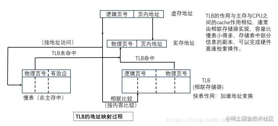 解决问题:为了避免对主存访问次数的增多,可以对页表本身实行二级缓存,把页表中的最活跃的部分存放在高速存储器中。这个专用于页表缓存的高速存储器部件通常称为转换后援缓冲器(TLB) ,又称为快表。而保存在主存中的完整页表则称为慢表。快表的作用是加快地址变换。