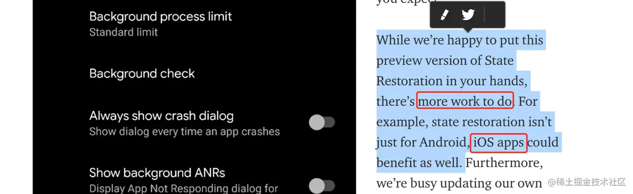 在 Android 中,是通过 onSaveInstanceState 进行实现的。 当系统"未经你许可" 时销毁了你的 Activity 时,比如横竖屏切换、点击 Home 键、导航菜单栏切换。系统会提供一个机会让通过 onSaveInstanceState 回调来你保存临时状态数据,这样可以保证下次用户进入时产生违和感。