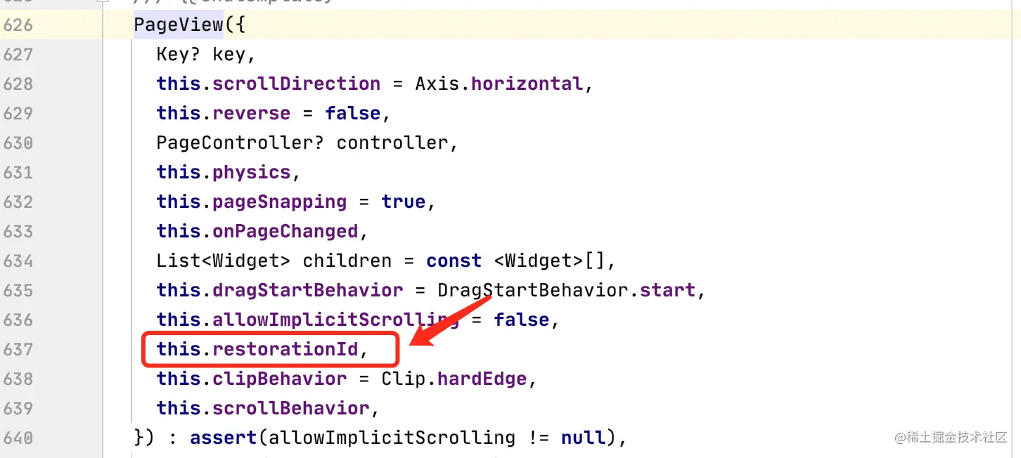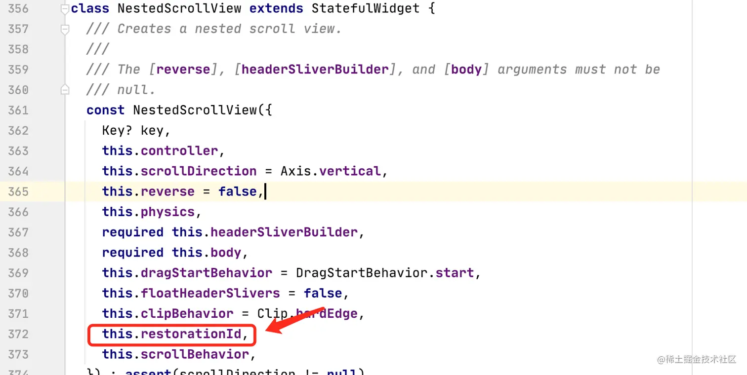 当看完上面的小 demo,你可能会比较好奇,滑动体系中是如何存储的,下面我们就来看看吧。我们追随 ListView 的 restorationId 属性踪迹,可以看到它会一路向父级构造中传递。最终在 ScrollView 中作为 Scrollable 组件的入参使用。