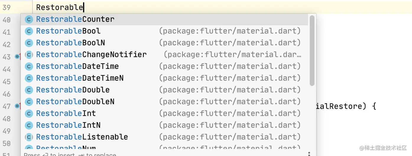 刚才有的是 RestorableInt,可能有人担心别的数据类型怎么办。Flutter 中提供了很多 RestorableXXX 的数据类型以供使用。如果不够用,可以通过拓展 RestorableProperty<T> 来自定义 RestorableXXX 完成需求。