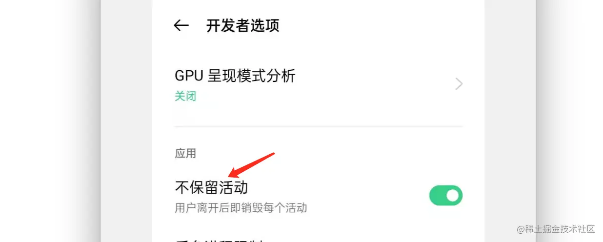 另外,说明一点,为例方便演示恢复的触发,需要在 开发者选项 中勾选 不保留活动 ,其作用是用户离开后会杀掉 Activity 。比如点击Home键、菜单栏切换界面时,Activity 并不为立即销毁,而是系统视情况而定。打开这个选项可以避免测试的不确定因素。注意:测试后,一定要关掉 。
