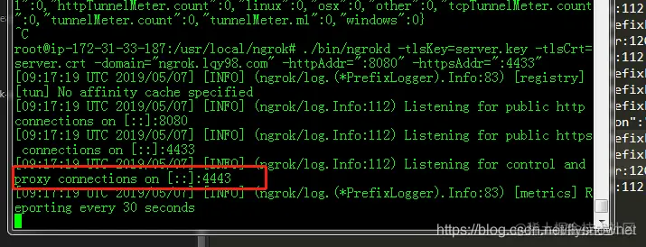 检查 ngrok.cfg 文件里的端口号是否与 Listening for control and proxy connections on [::]:4443 端口号一致。