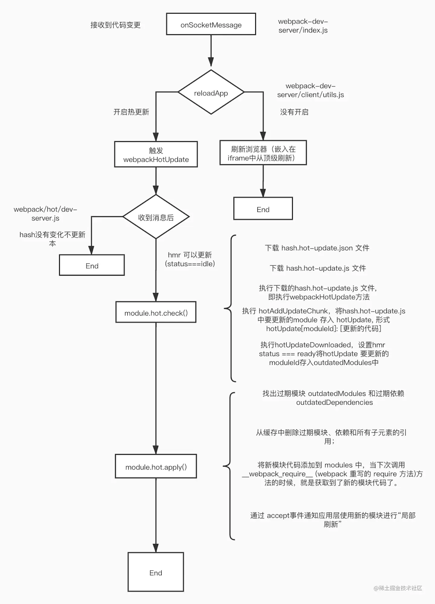 监听 webpackHotUpdate 事件,然后调用 module.hot.check 和 module.hot.apply 方法, 如果没有开始hmr的话,没有module.hot 属性,开启hmr后HotModuleReplacementPlugin这个插件在module上加上了hot属性