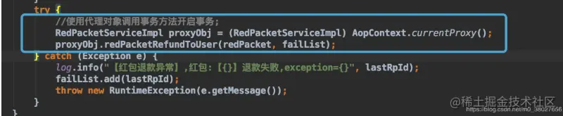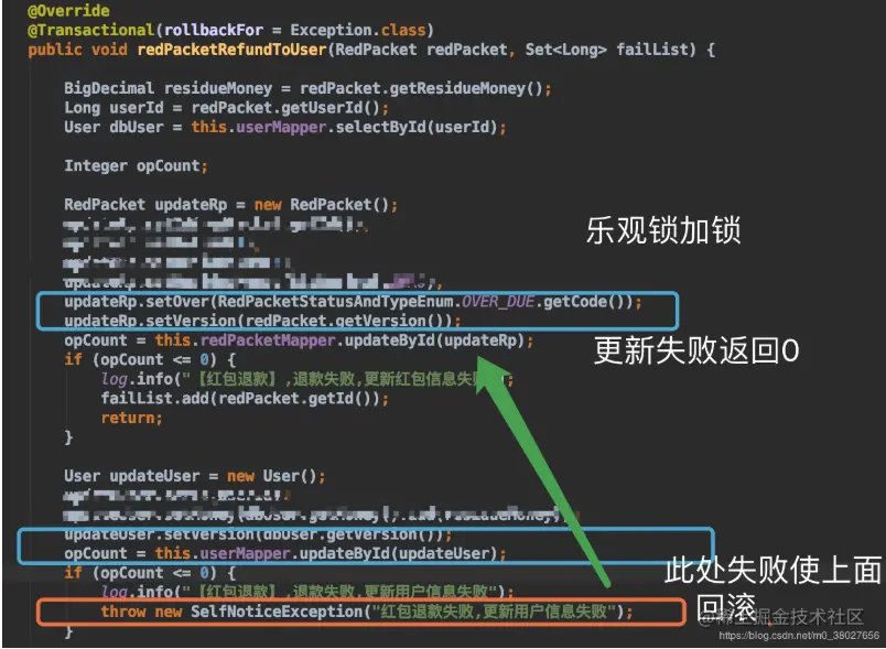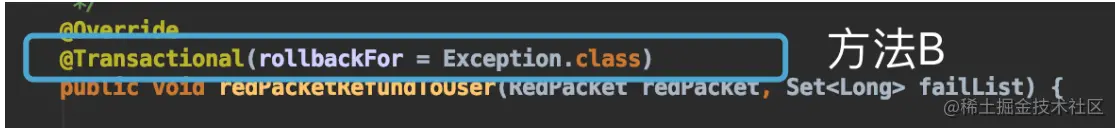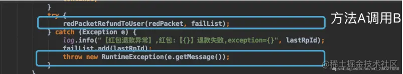 从上图可以看到,如果方法B中User更新出错后需要回滚RedPacket数据,所以User更新失败就抛出了继承自RuntimeException的自定义异常,并且在调用方把这个异常catch到重新抛出,触发事务回滚,但是并没有执行;