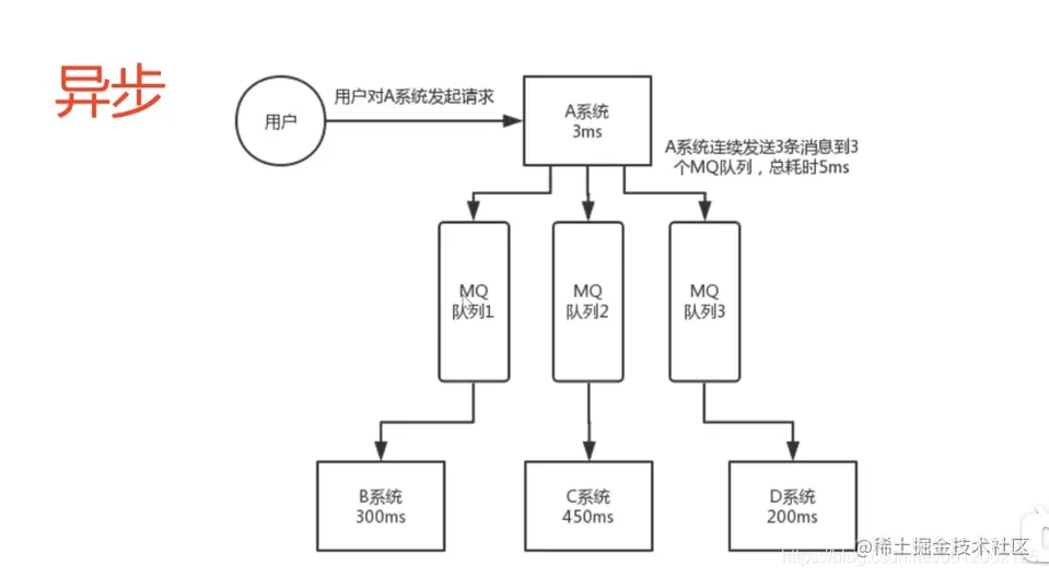 引入MQ之后,A系统在发起下单请求时只需要将请求数据发送到MQ中,然后直接返回响应给用户,最后再由BCD系统去消费下单的消息,这样用户感受到的处理时间是A系统的处理时间。