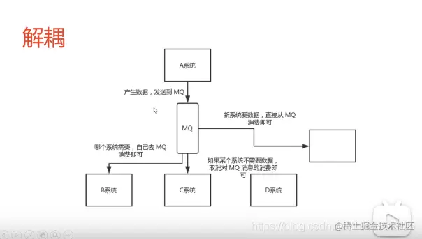 A系统如果要调用B、C、D系统时,只需要将A的请求数据发送到MQ中再由BCD系统区进行消费,添加了MQ之后如果再需要新增修改BCD系统的功能就和A系统关联不大了。