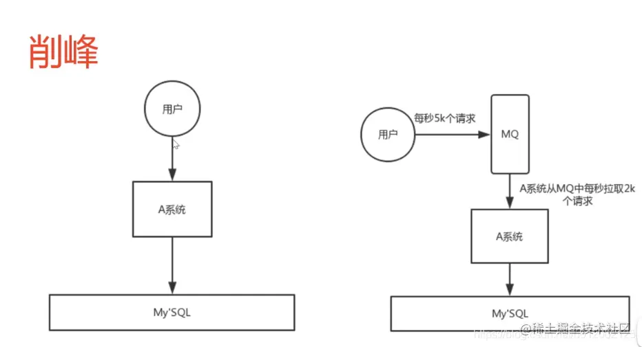 假设一个系统平常的流量只有1万tps,在搞活动的时候流量高峰则是10万tps,按照成本考量企业设计系统时不会按照10万tps要求,但是有时候有需要支持10万tps怎么办呢?解决方法就是加入一个MQ,在搞活动时当有10万请求时,请求数据会被放到MQ中,A系统批量取出数据进行处理,如果系统的处理能力是每秒2万,则只需5秒钟就可以处理完所有数据,这样就不会出现10万tps同时需要处理给到系统处理造成系统或数据超出负载而崩溃的问题。