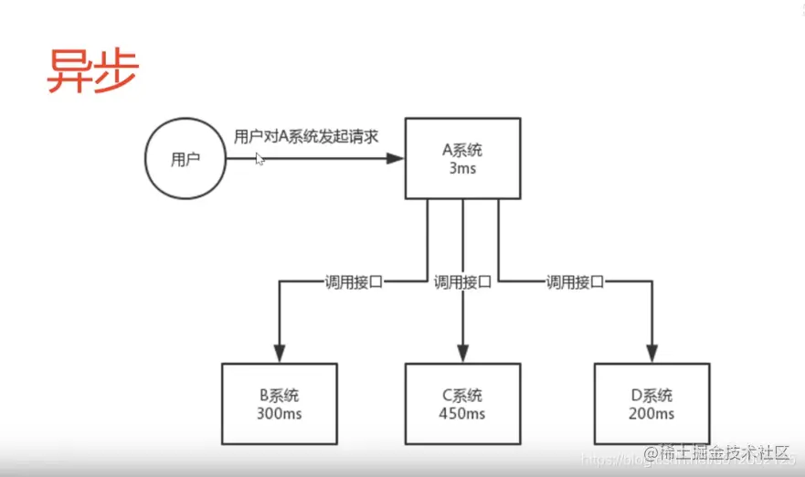 系统没有异步前一个请求给到A系统,A系统需要调用B,C,D三个系统串行处理,则处理的时间是所有系统处理时间的总和,例如商品下单时需要经过支付、库存、订单系统处理