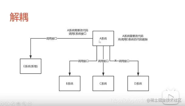 在如下系统中,如果B、C、D功能发生变化则A系统也要跟着改变,或者是新增系统E时,也需要增加A的调用,这样A系统与B、C、D、E就是耦合在一起的,新增或修改功能就比较麻烦。