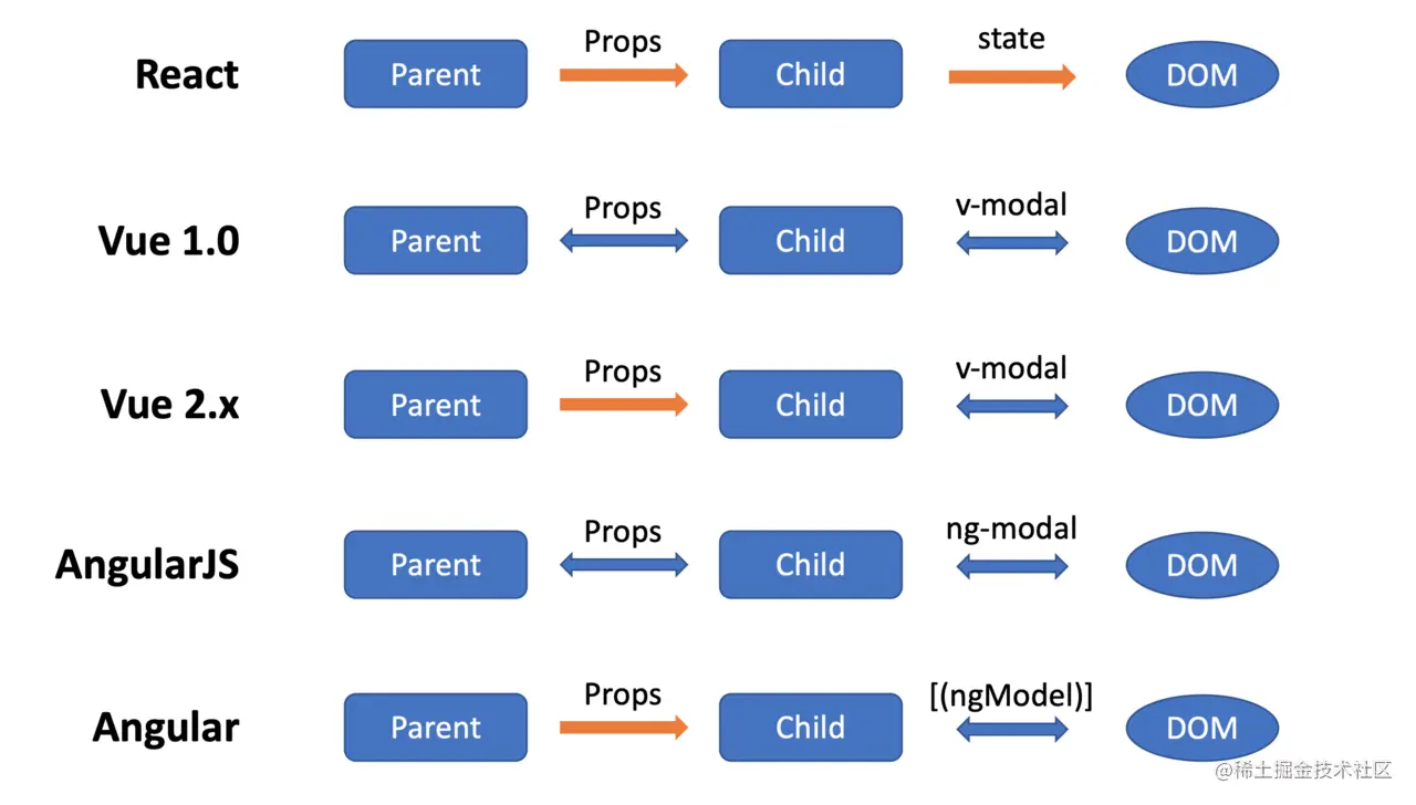 几大框架数据流向和数据绑定关系 lvli0401 2021-07-21 359 阅读1分钟 注明:parent和child是数据流向,比如父组件可以改变子组件的props值,但是子组件无法直接改变父组件的props值。child和dom之间是数据绑定,比如改变组件的值,必须通过setstate改变,无法通过改变dom值来改变state