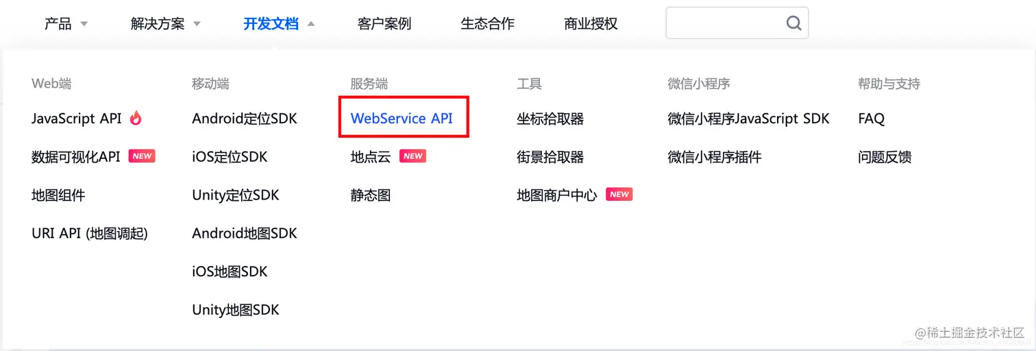 滑动到上方菜单的开发文档 -> 选择服务端下的WebService API:
