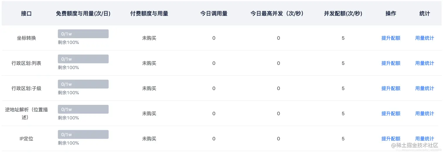 同时,可以在查看配额界面查看各接口的用量情况:
