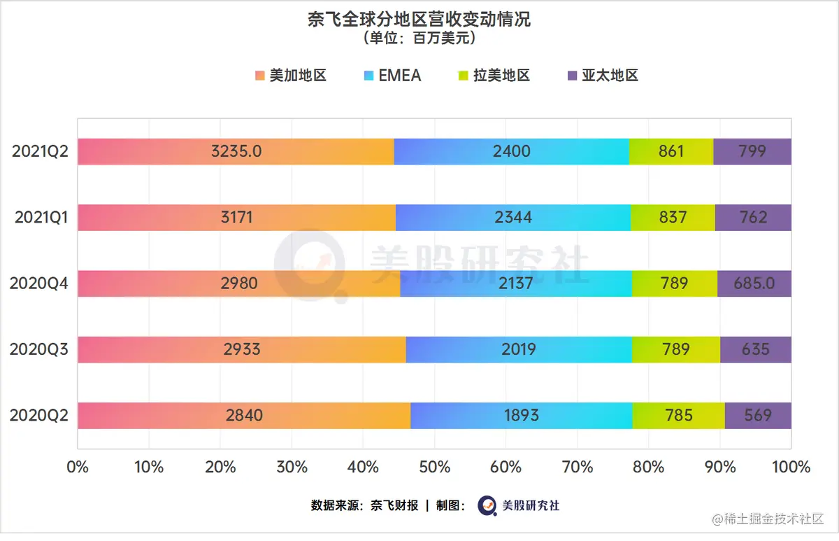 2021年第二季度,奈飞实现营收73.42亿美元,同比增长19%,可以肯定的是奈飞依然是流媒体市场的庞然大物。从地区看,大本营美加地区依然是收入主力。