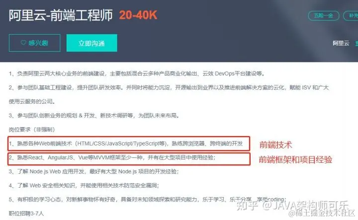 以薪资高,好入门的前端岗位为例,阿里云对应届生的要求是熟练掌握前端技术,熟悉前端框架,并具有相关项目经验: