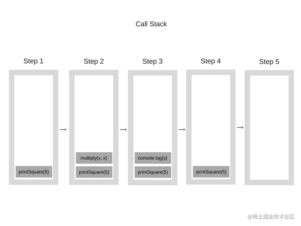 当执行进入一个函数,调用栈把它置于栈的顶部。 如果函数调用结束,则从栈顶部移除该函数。 举个栗子。查看如下代码: