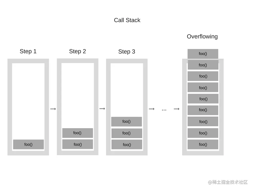 但是这个函数会递归调用其自身,而没有任何结束条件。所以在每步执行过程中,调用堆栈会反复地添加同样的函数。执行过程如下所示: