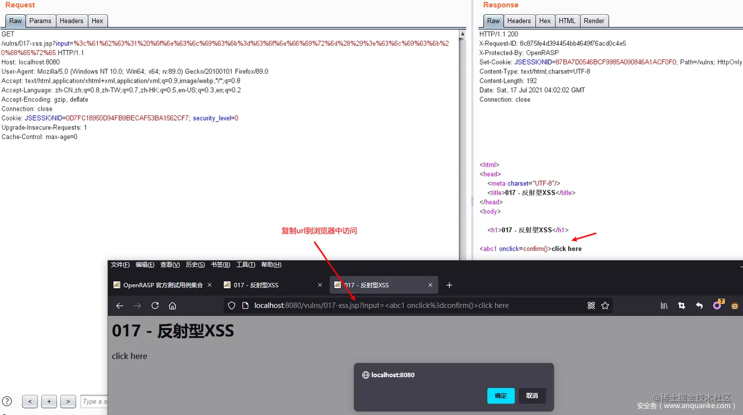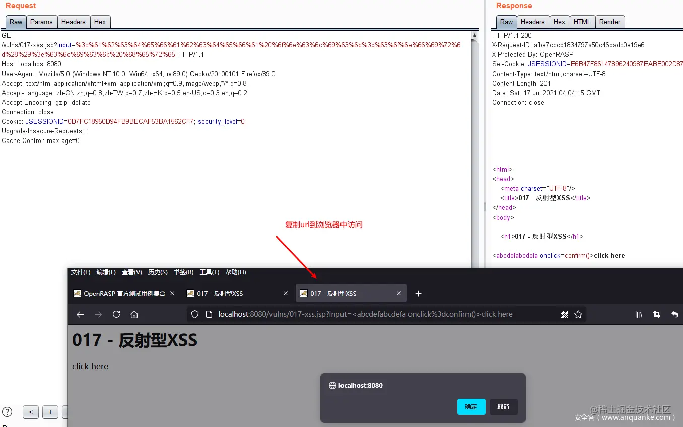burpsuite repeater中右键”copy url”,复制url到浏览器中访问,点击即可触发弹框。