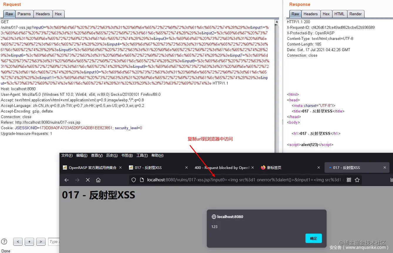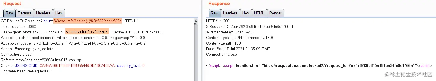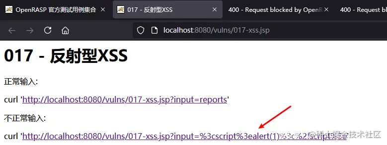 openrasp默认只能检测反射型XSS,存储型XSS仅IAST商业版支持。对于反射型xss,openrasp也只能检测可控输出点在html标签外的情况,本文的绕过方法是针对这种情况。如果可控输出点在html标签内,如<input type="text" value="$input">或<script>...</script> 内部,openrasp几乎检测不到。