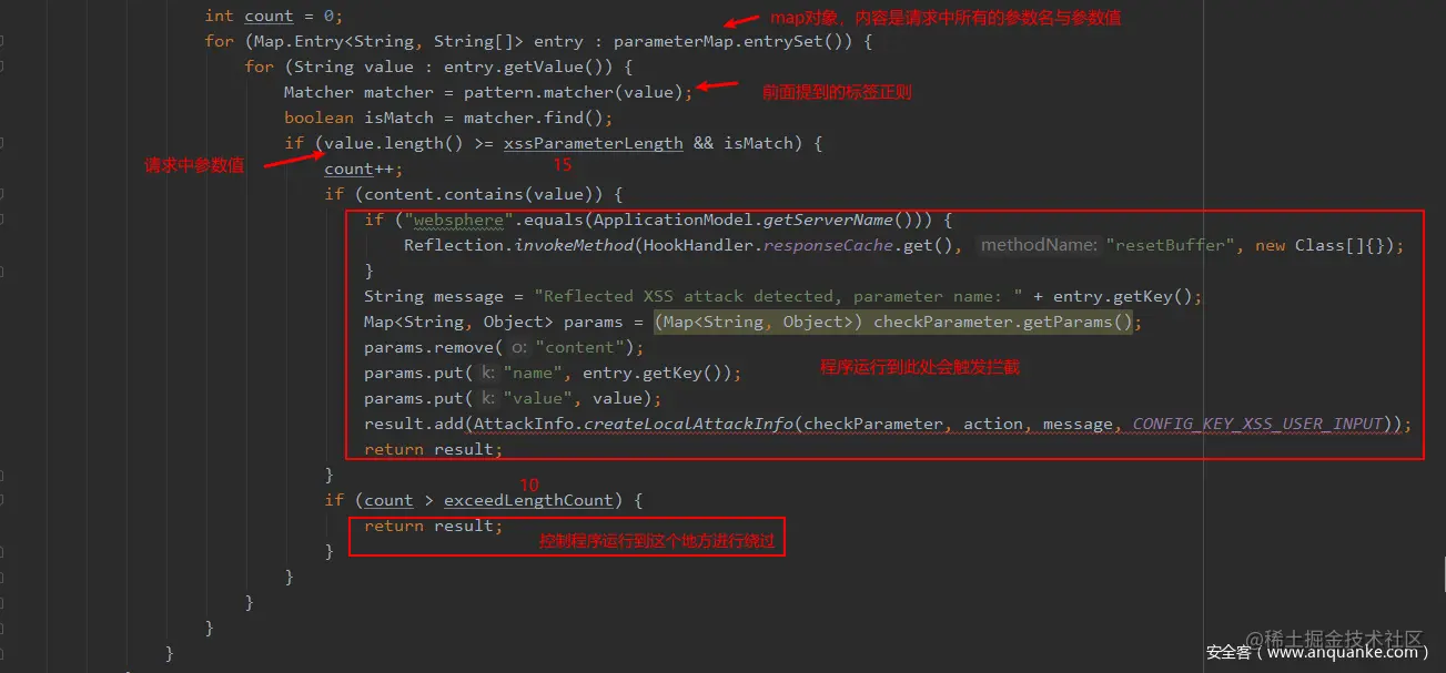 openrasp xss具体检测代码实现在这个文件中agent/java/engine/src/main/java/com/baidu/openrasp/plugin/checker/local/XssChecker.java。下面的一段代码是对”当用户输入长度超过15,匹配上标签正则,且出现在响应里,直接拦截”的具体实现。