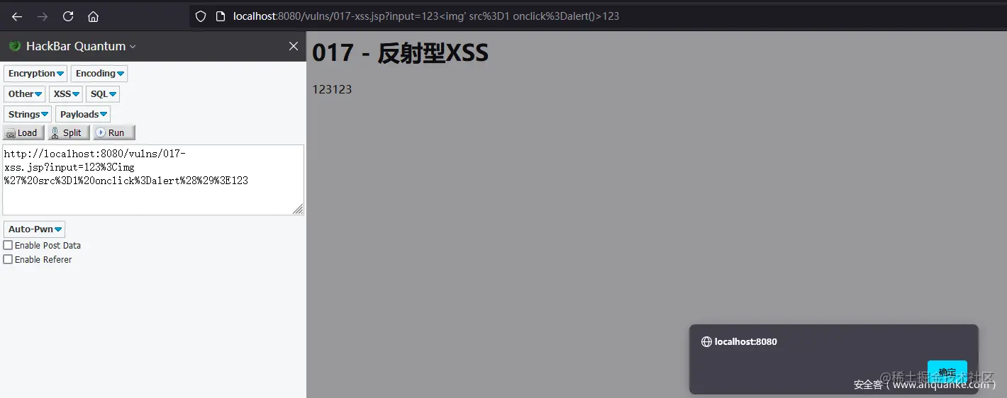 例如,使用123<img' src=1 onclick=alert()>123 ,url编码后,点击也能弹框。