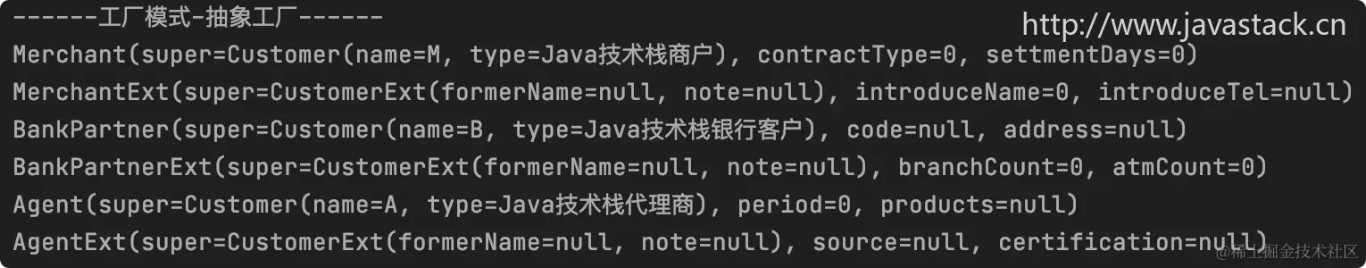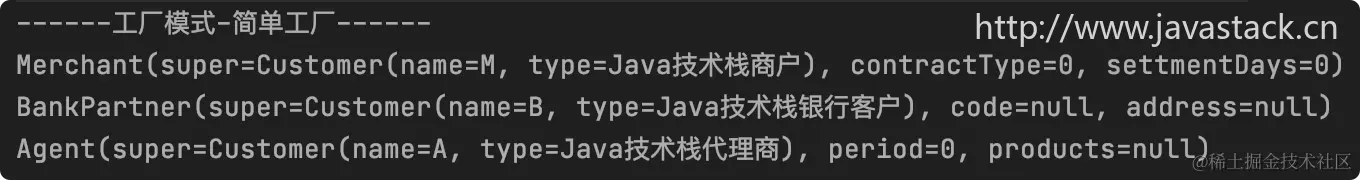 Customer merchant = merchantFactory.createCustomer("M", "Java技术栈商户");