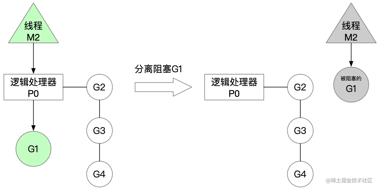 假如当G1有执行文件阻塞的操作,这个时候逻辑处理器P0会将G1分离处理,同时与线程M2分离,如下图: