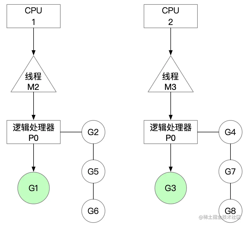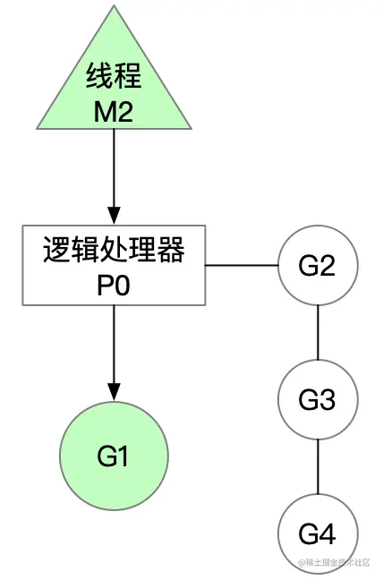 我们假设当前线程为M2,逻辑处理器为P0,有4个协程G1、G2、G3、G4等待执行,当前正在执行G1