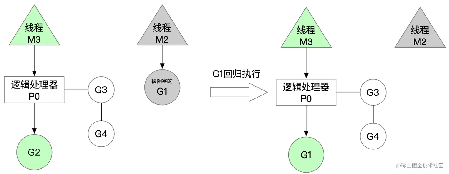 此时M3正常执行goroutine,过了一段时间,原有的G1阻塞操作完成,等待被继续执行,而此时G2也执行完成,G1会被重新分配回到逻辑处理器P0进行执行。