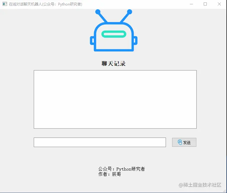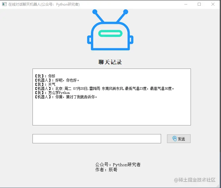 今天辰哥教大家做一个在线聊天对话机器人桌面应用,已经打包成exe可执行文件,读者可以直接拿来使用, 先上演示图