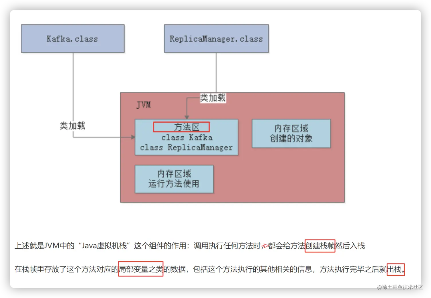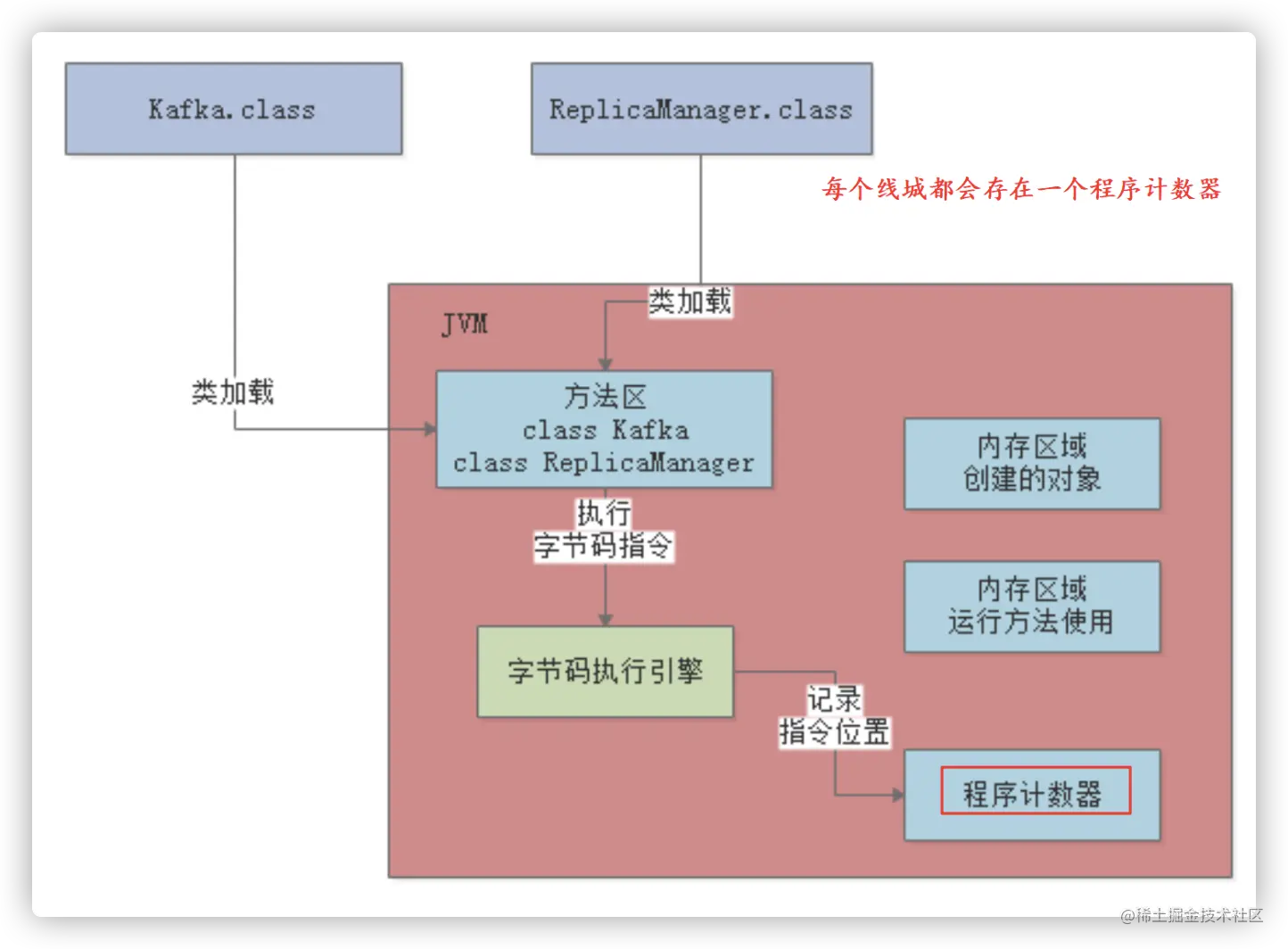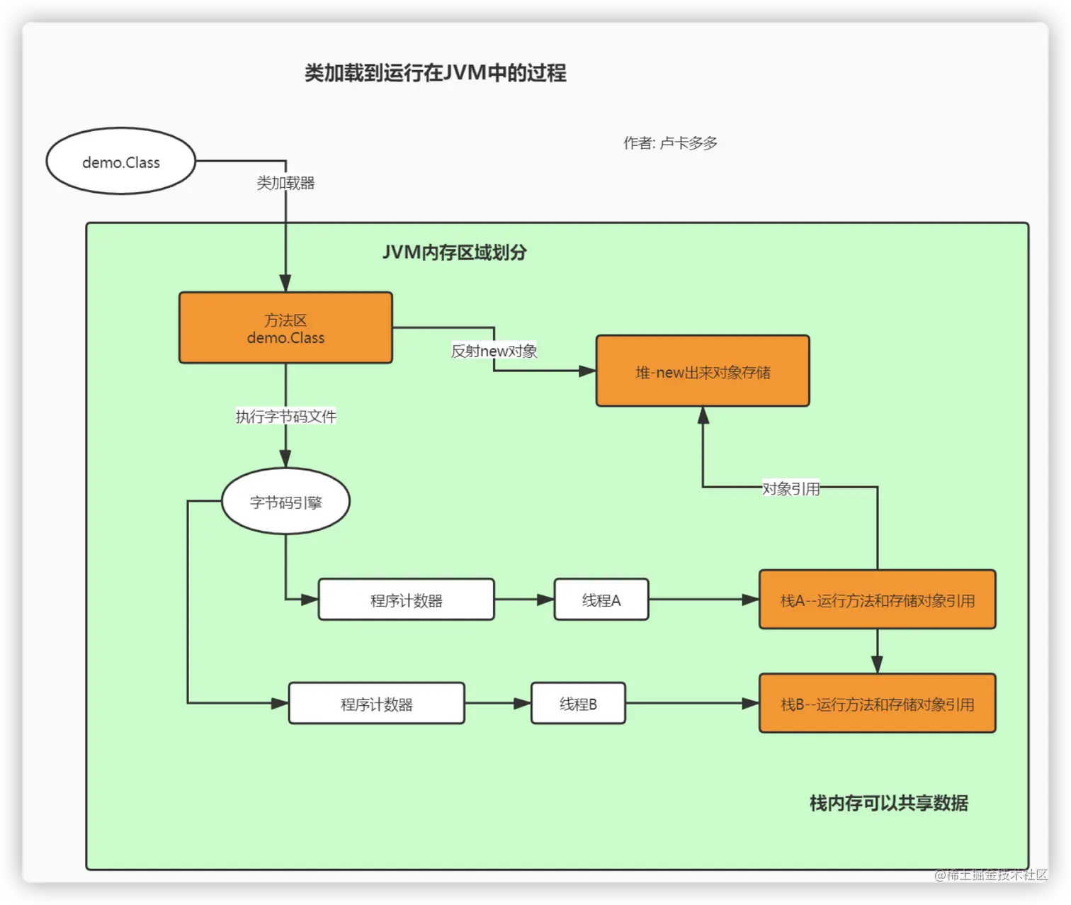 首先, 当二进制的字节码文件class,经过类加载器,加载到jvm中之后, jvm各个部分就开始分工合作了;