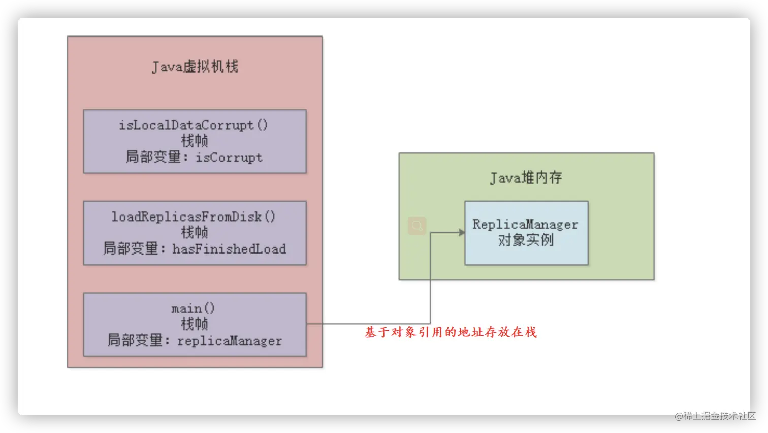 当前内存区域中, 只存在堆管存储对象,栈管运行方法和存储对象的引用地址,